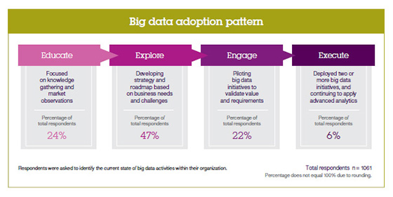 IBM研究機構最近與牛津大學賽德商學院合作,有份研究報告最佳的五個方法來使用海量資料(the top five ways to get started with big data)。依據研究結果,歸類統計出大量資料採用總共分為四個階段:訓練Educate、探索Explore、參與 Engage、執行Execute。參照圖一:大資料採用階段。
