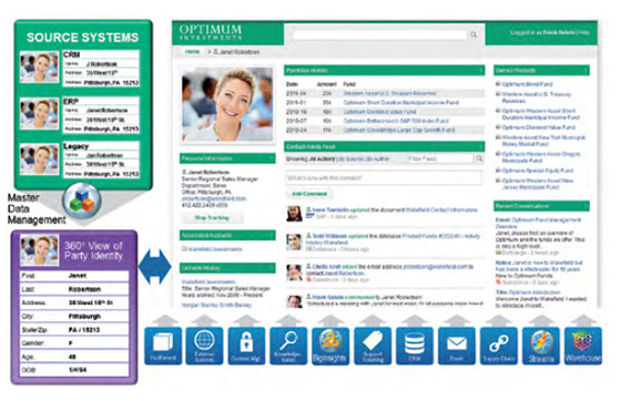 這個介面,員工可以看到客戶基本資訊,買哪些產品、目前支援甚麼專案、關於他們公司有甚麼新聞、最近的轉變…等等。從InfoSphere BigInsights和IBM Stream、IBM Cognos business intelligence和IBM SPSS等產品,分析的內容。員工可以透過與客戶互動透過客製化的內容。藉由這樣的此互動,員工可以提供正確的答案給客戶而且也可以增加垂直銷售的機會。