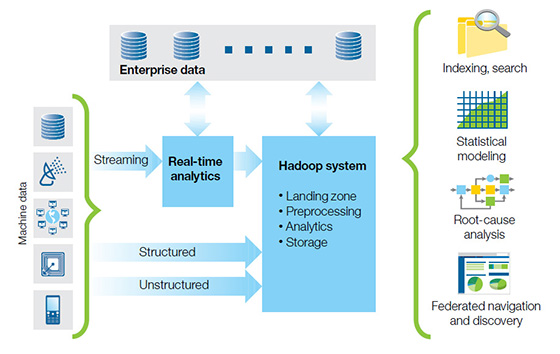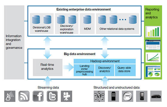 可查詢的數據存儲:在這種方法中,透過使用資訊整合和工具庫,可將應用程式資料庫中的較不常存取或老舊的資料卸載。這有助於將企業較不常接觸的數據,用低成本存儲方式儲存,還可同時使用InfoSphere BigInsights中的查詢或BI工具維持這些資料取得的便利性。InfoSphere Data Explorer 可以用來查看和瀏覽所有已存儲在BigInsights中的InfoSphere數據。