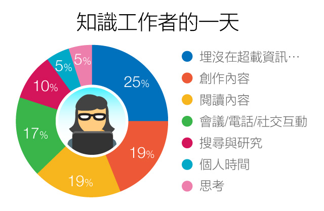 這是非常有趣的,知識工作者的基礎便是動腦力,但思考這回事僅佔用一天的5%,處理資訊超載問題卻佔據了最大部分。