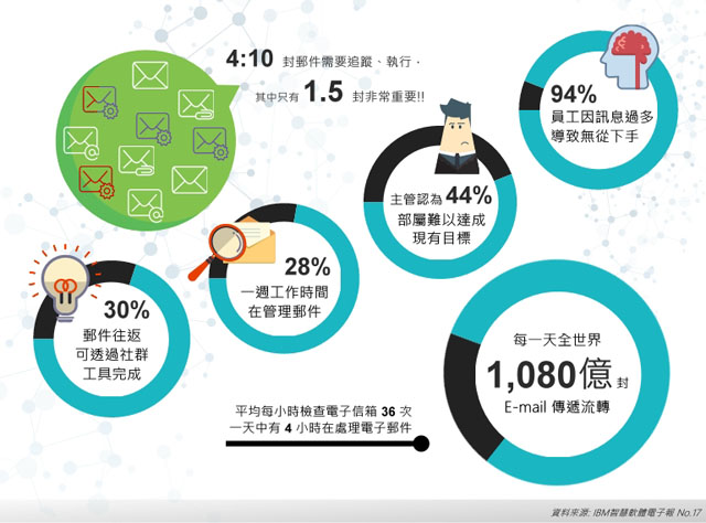 對許多企業員工來說,早上起床第一件事,就是滑開手機收信;上班第一件事,就是打開電腦回信。根據Radicati Group研究指出,每一天全世界有1080億封電子郵件傳遞流轉,每一個員工平均每小時檢查電子信箱36次,處理電子郵件佔去一天裡將近4小時的時間。