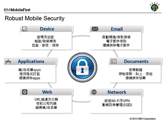 - MaaS360 Mobile Application Security 企業行動應用程式:強制執行者使用者認證,具備完整操作及安全性管理的行動應用程式容器,可防止資料外洩。